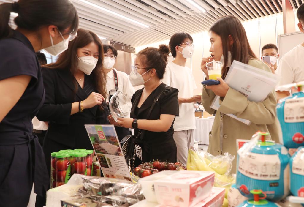 第五届进博会食品及农产品展区、医疗器械及医药保健展区展前供需对接会在国家会展中心(上海)举行。这是对接会嘉宾在参展企业展位前品尝水果(2022年8月30日摄)。新华社记者方喆 摄