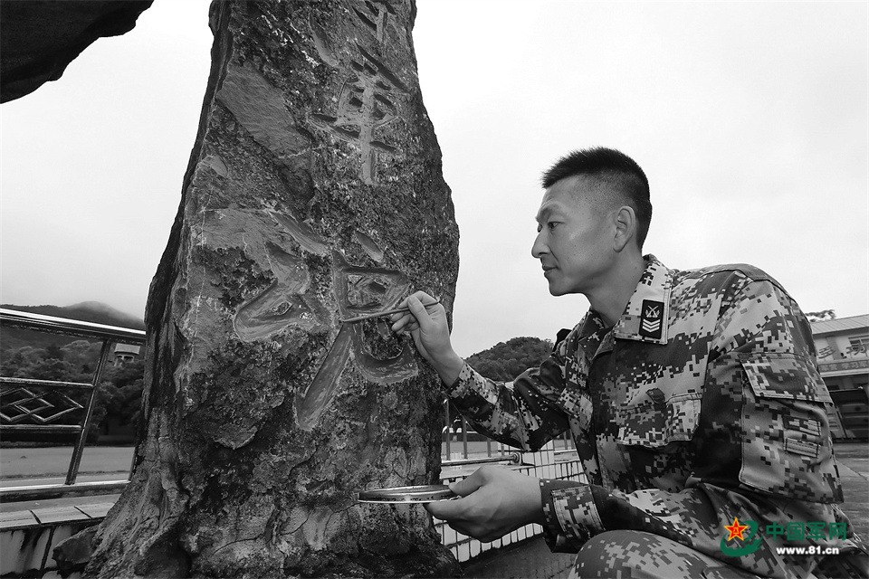 不远处,一座守库石让李京超久久凝视。“虎踞群山剑指大洋”八个苍劲有力的“库训”,被官兵描得鲜红,刻进被岁月侵蚀的巨石中。