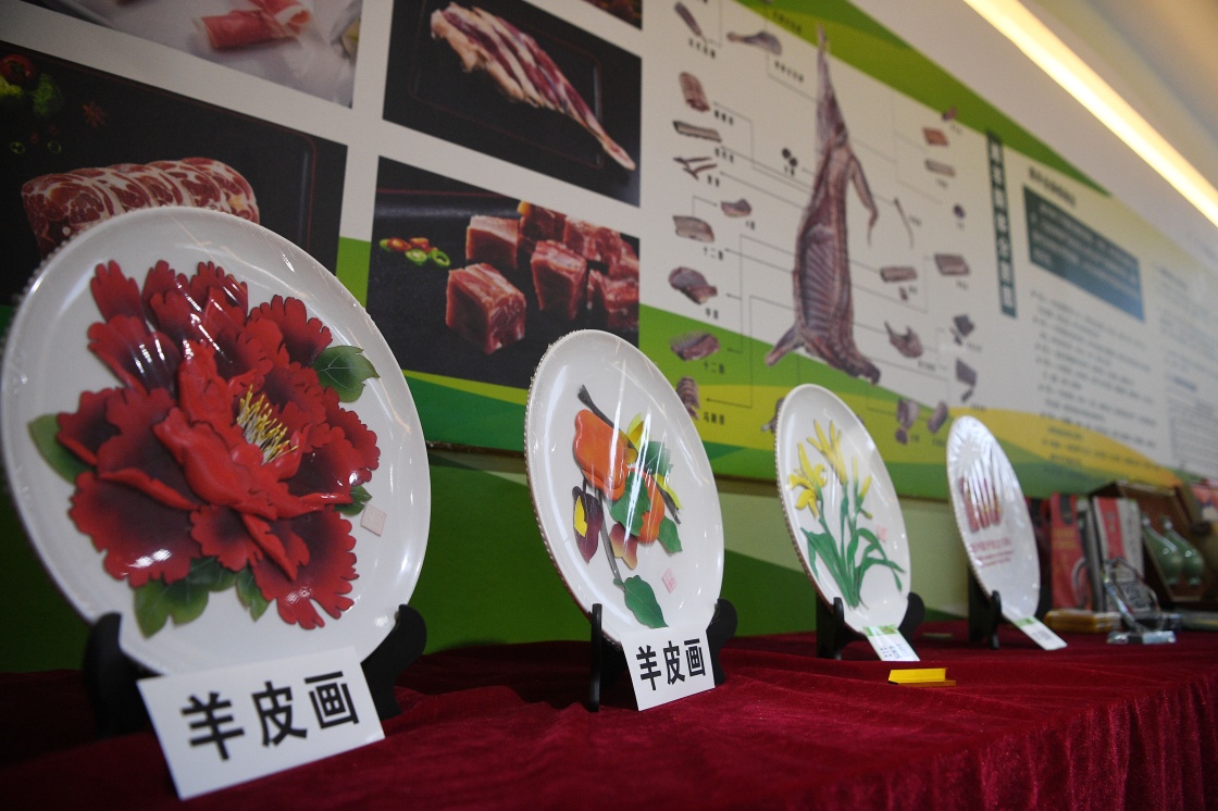 盐池滩羊产业发展集团展出的羊皮画(5月2日摄)。