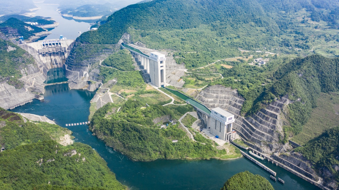 500吨级标船从遵义市构皮滩水电站通航工程下游引航道驶入第三级承船厢(2021年6月22日摄,无人机照片)。新华社记者 陶亮 摄