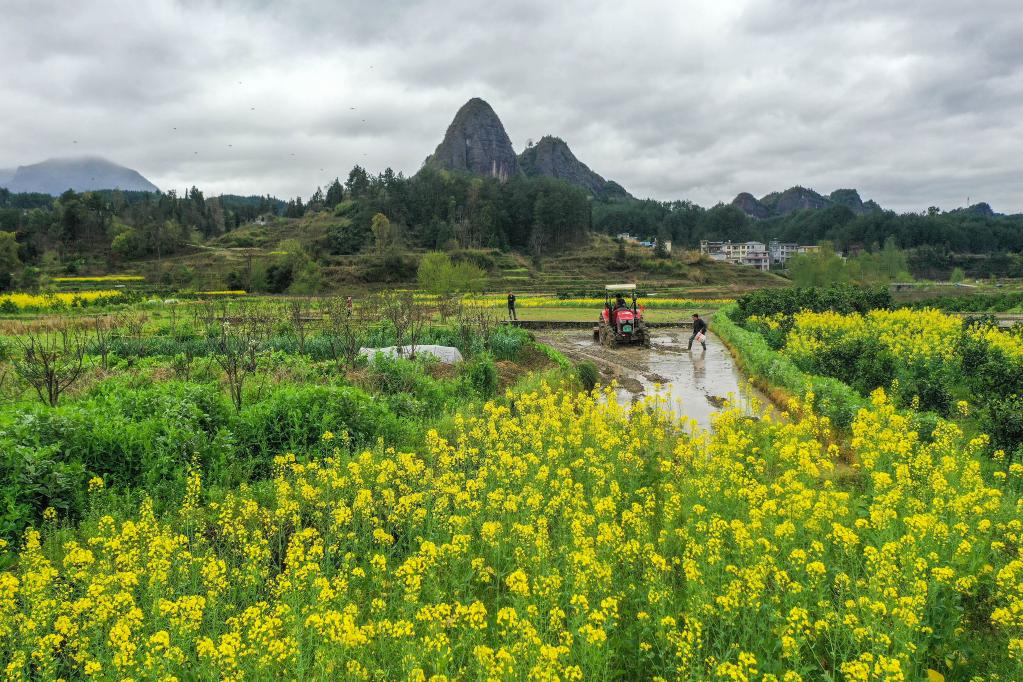 3月20日,湖南省湘西土家族苗族自治州龙山县兴隆街道,农民在田间耕作(无人机照片)。新华社发(曾祥辉摄)
