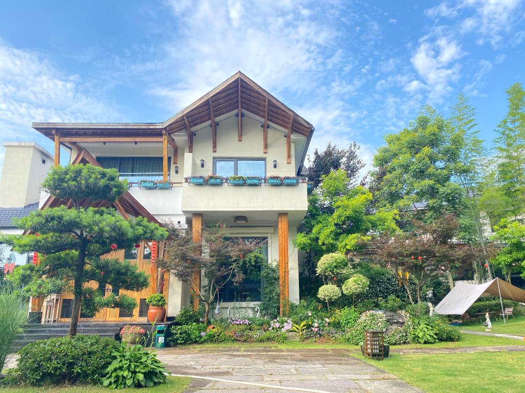 初夏的安吉“半日闲·朴宿”民宿,庭院内草坪、盆景、树木与竹林参差分布,搭配着现代民居、游泳池和秋千,仿佛色彩缤纷的童话世界。