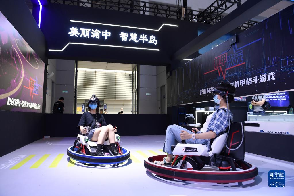 2021年8月23日,观众在2021中国国际智能产业博览会上通过MR技术体验机甲格斗游戏。新华社记者 唐奕 摄