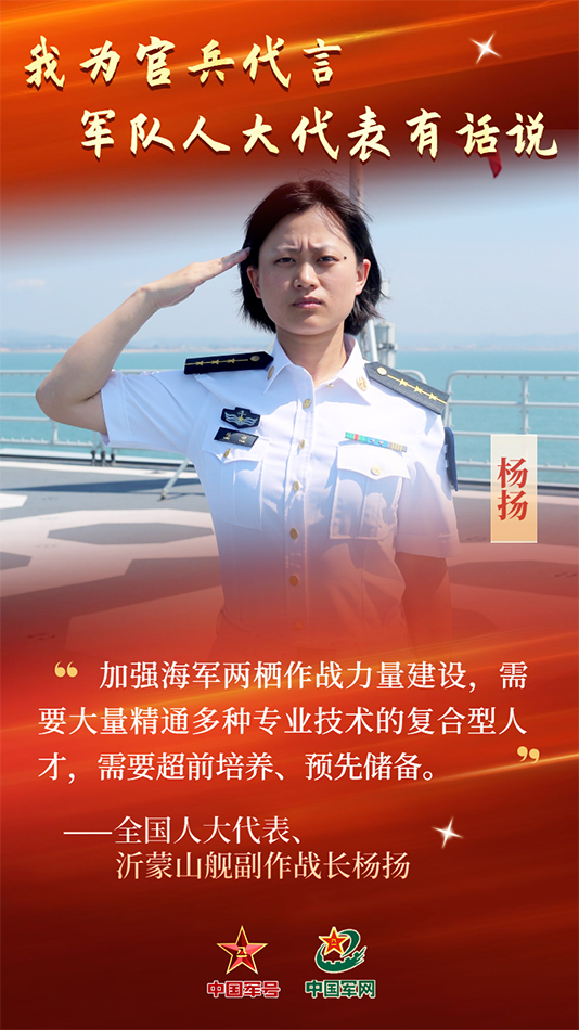 当选第十三届全国人大代表以来,杨扬始终聚焦部队战斗力提升和基层人才队伍建设,通过调研走访、问卷调查、向相关业务部门咨询等方式,先后提出意见建议70余条,包括舰艇官兵心理服务、基层士官骨干培养与保留、为军人父母提供养老服务等方面。近年来,杨扬所在舰结合实战化训练,探索出新战法训法,积累了宝贵的经验,培养了两栖作战人才。今年的人代会上,她结合工作实践与调研结果,带来了关于加强两栖作战力量建设的建议。她说:“加强海军两栖作战力量建设,需要大量精通多种专业技术的复合型人才,需要超前培养、预先储备。”