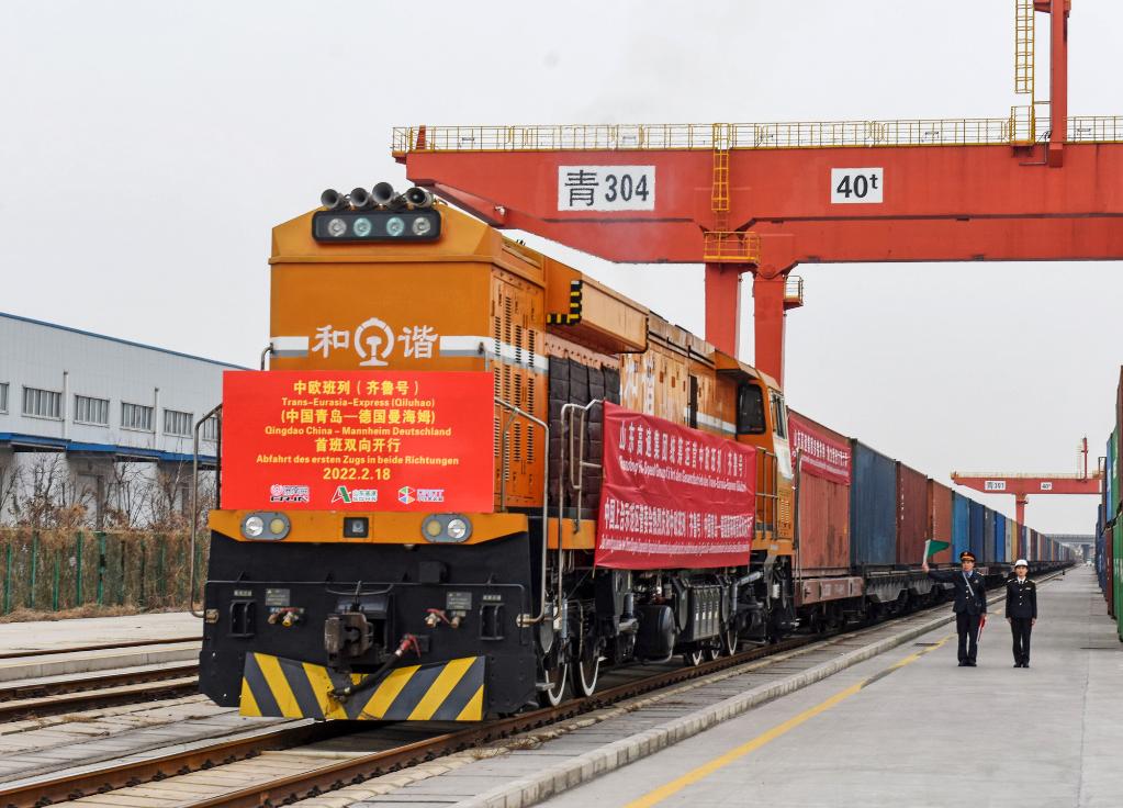 2月18日,中欧班列(齐鲁号)中国青岛—德国曼海姆双向对开首班列车从上合示范区青岛多式联运中心出发。(新华社发,王昭脉摄)