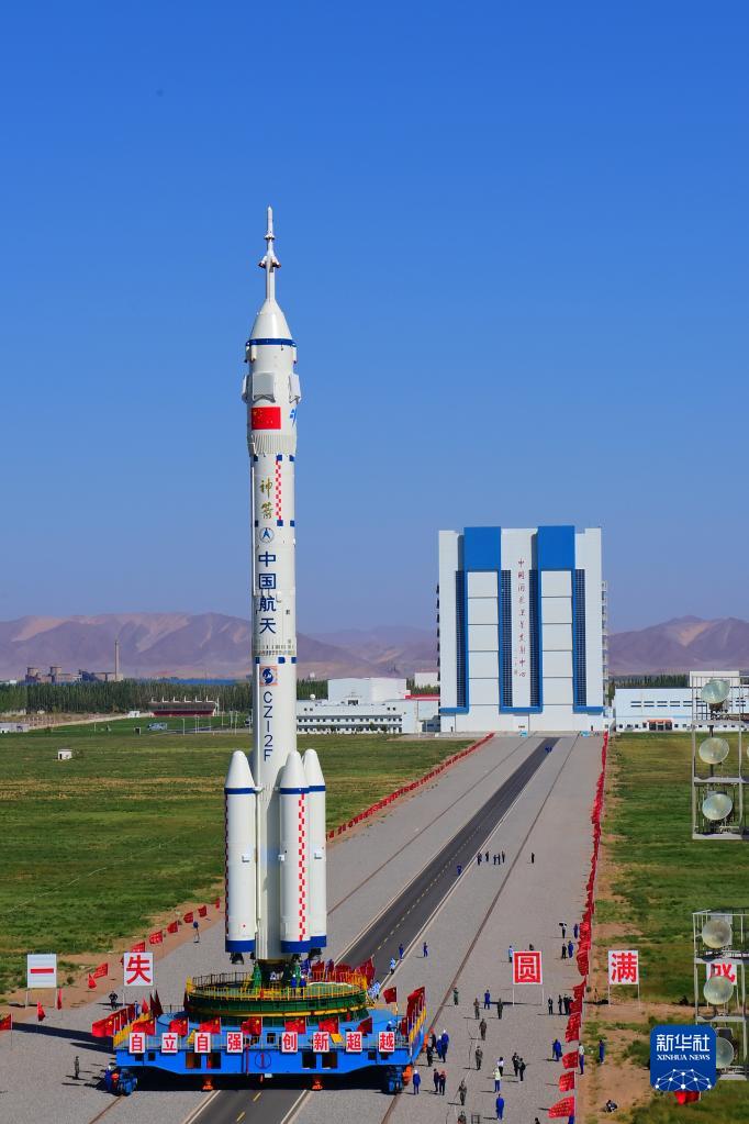 5月29日,神舟十四号载人飞船与长征二号F遥十四运载火箭组合体转至发射区。新华社发(汪江波 摄)