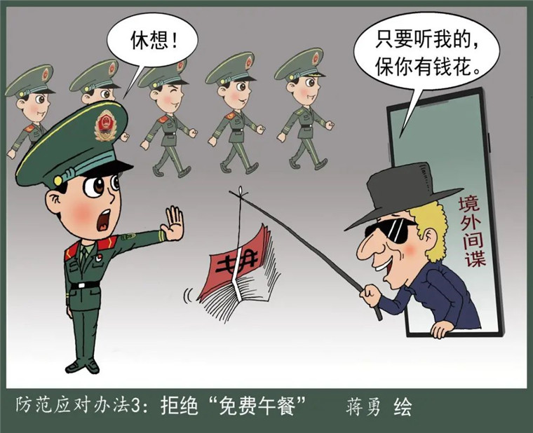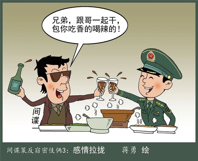 敌特无孔不入,威胁就在身边。军队作为担负保卫国家安全重大使命责任的重要力量,历来是境内外敌特分子拉拢腐蚀的对象之一,尤其在高速发达的网络时代,他们利用各种信息渠道和技术手段,或以金钱、美色为诱,或以恫吓、威胁相逼,稍不留神就会掉入其精心设计的“陷阱”。下面,以一组漫画形式揭开间谍策反窃密伎俩、提示防范应对之策,助力筑起防间保密的坚固防线。