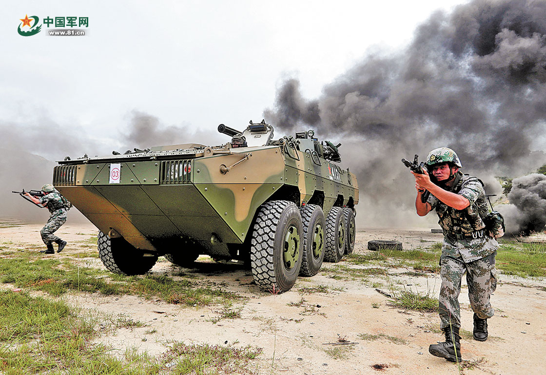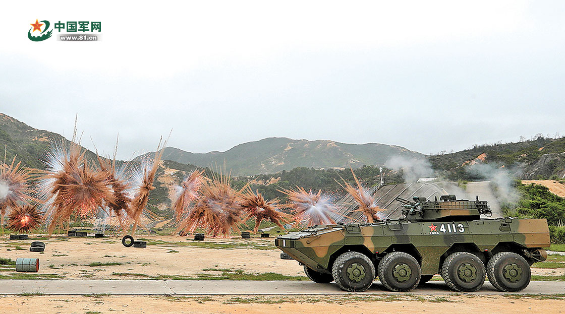 演练中,官兵驾驶装甲战车发射烟雾弹。