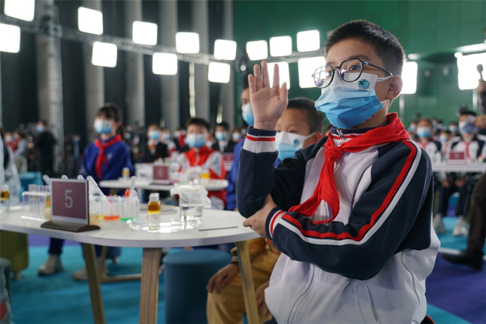 地面主课堂中国科技馆内的学生通过视频通话与航天员进行互动交流。