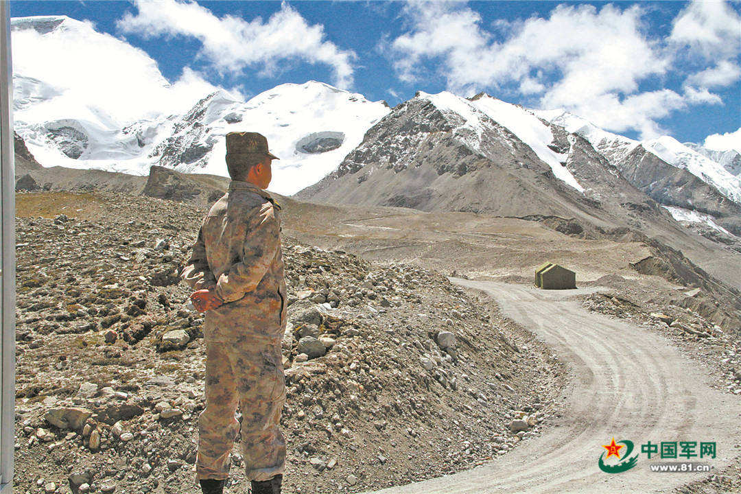 执勤岗哨位于一片空地,远处是连绵雪山,再远一点的地方便是官兵每天凝视的边防线。