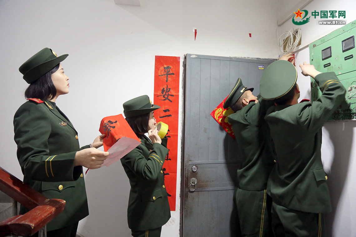官兵和惠妈妈一起贴福字。刘伟 摄