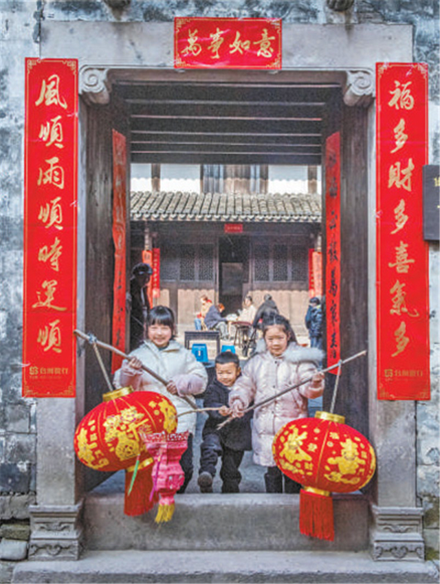 2月5日,小朋友手举灯笼在浙江省台州市仙居县横溪镇溪头村古宅里欢度春节。陈月明摄(影像中国)