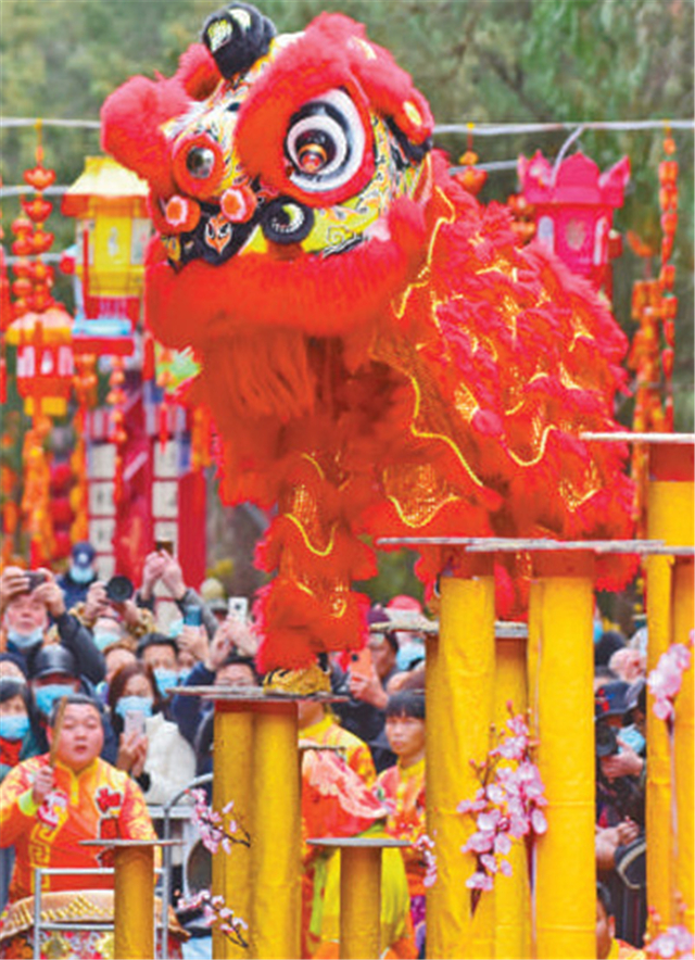 2月2日,人们在江苏省无锡市惠山古镇景区观看梅花桩舞狮民俗表演。还月亮摄(新华社发)