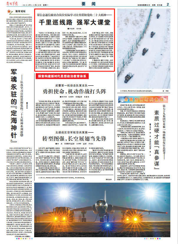 千里巡线路,强军大课堂。连日来,该旅官兵深入学习宣传贯彻党的二十大精神,大家纷纷谈认识、表决心,不断将学习报告焕发出的政治热情转化为练兵备战的实际行动。