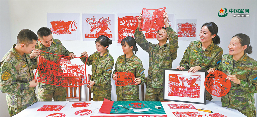 空军雷达某旅组织官兵创作剪纸作品,表达对党的美好祝福。闫跃帅摄