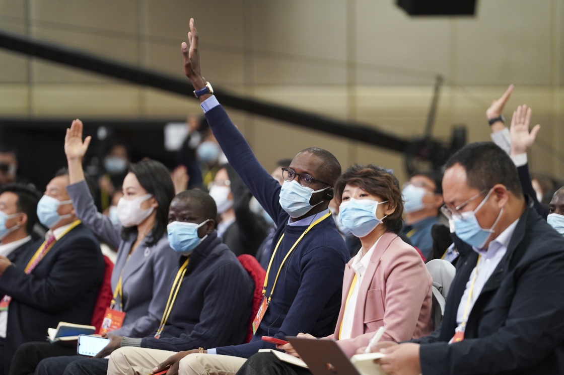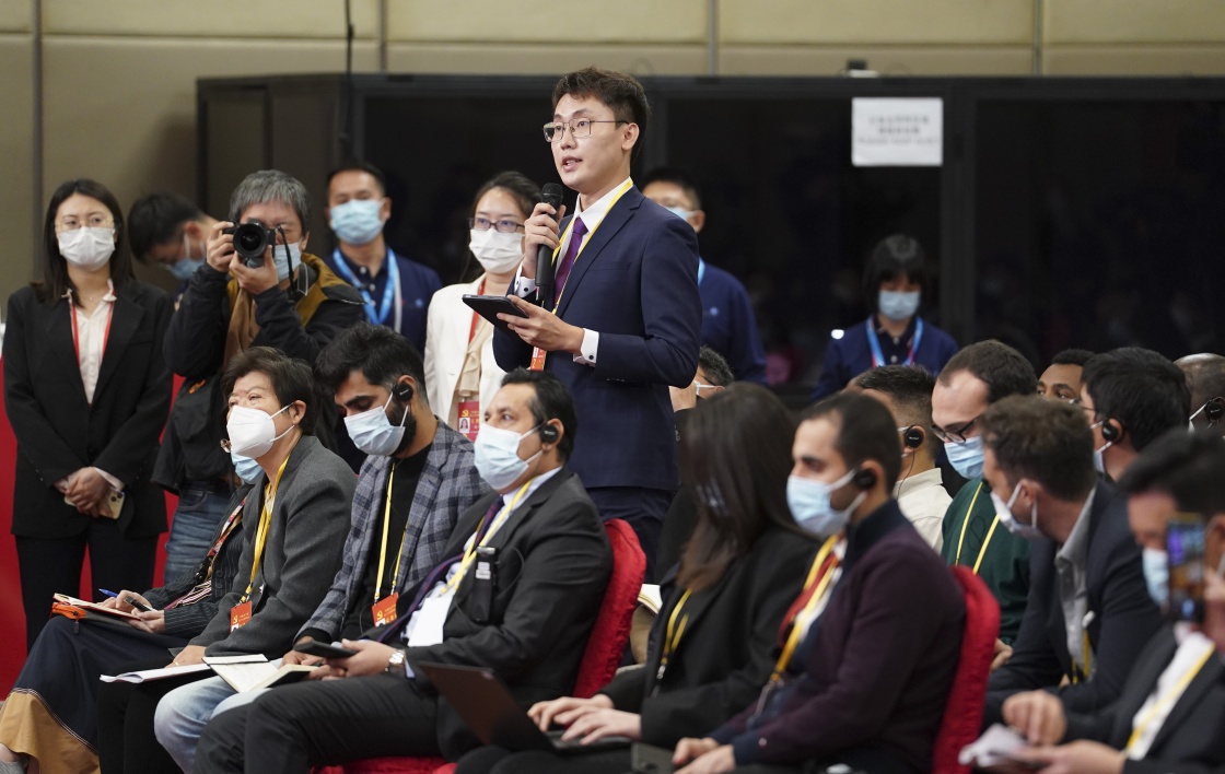 这是记者在分会场举手提问。新华社记者 陈晔华 摄
