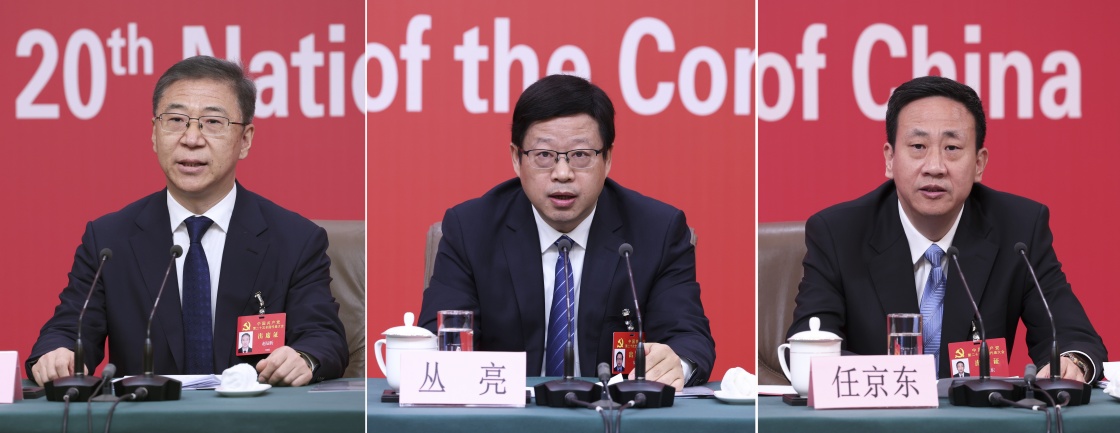 10月17日,中国共产党第二十次全国代表大会新闻中心举行记者招待会,请国家发展和改革委员会党组成员、副主任赵辰昕,国家发展和改革委员会党组成员、国家粮食和物资储备局党组书记、局长丛亮,国家能源局党组成员、副局长任京东介绍贯彻新发展理念、构建新发展格局、推动高质量发展,以中国式现代化全面推进中华民族伟大复兴有关情况,并回答记者提问(拼版照片)。
