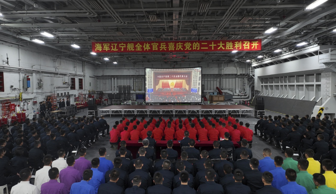 10月16日,辽宁舰全体官兵收看中国共产党第二十次全国代表大会开幕会。新华社发(任泽霖 摄)