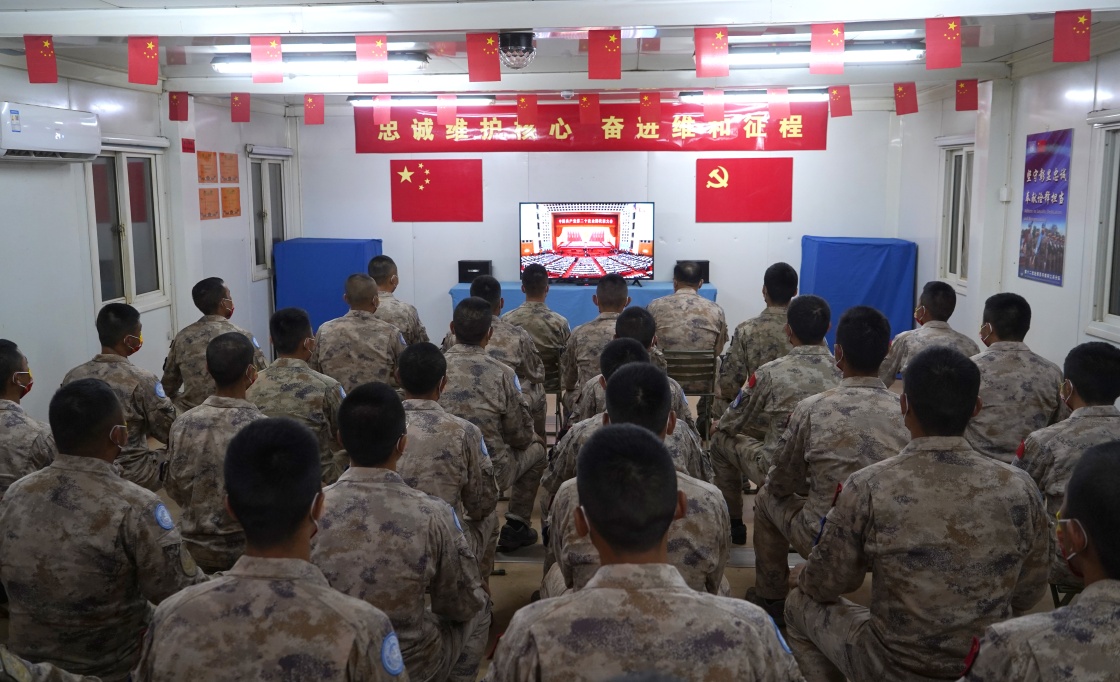 10月16日,中国第十二批赴南苏丹(瓦乌)维和工兵分队官兵收看中国共产党第二十次全国代表大会开幕会。新华社(张益玮 摄)