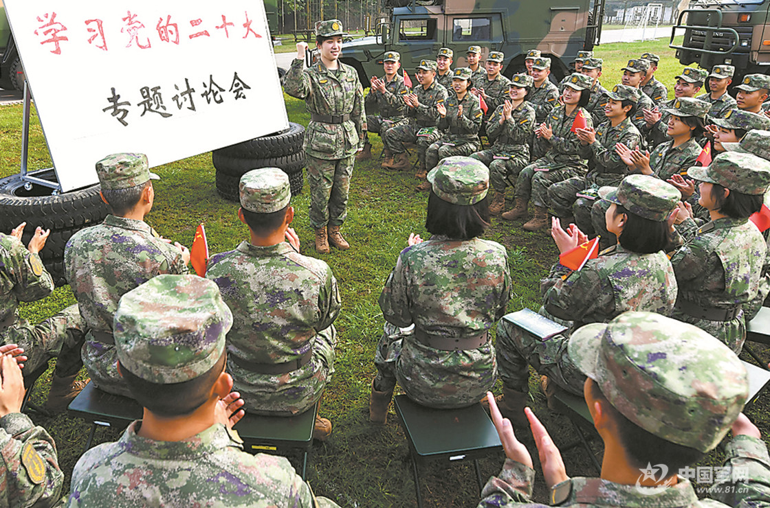 10月19日,火箭军某部官兵在训练间隙学习党的二十大报告,畅谈心得体会。赵吉垒摄