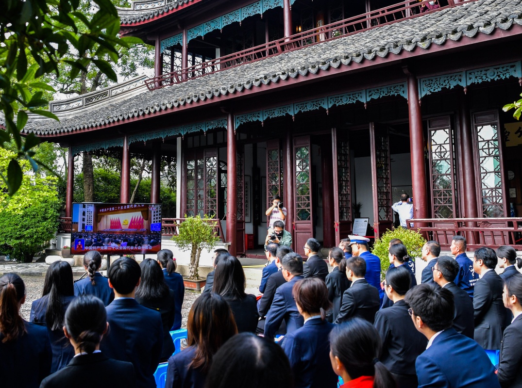 10月16日,武警浙江总队嘉兴支队官兵在南湖革命纪念馆前与工作人员一起收看中国共产党第二十次全国代表大会开幕会(无人机照片)。