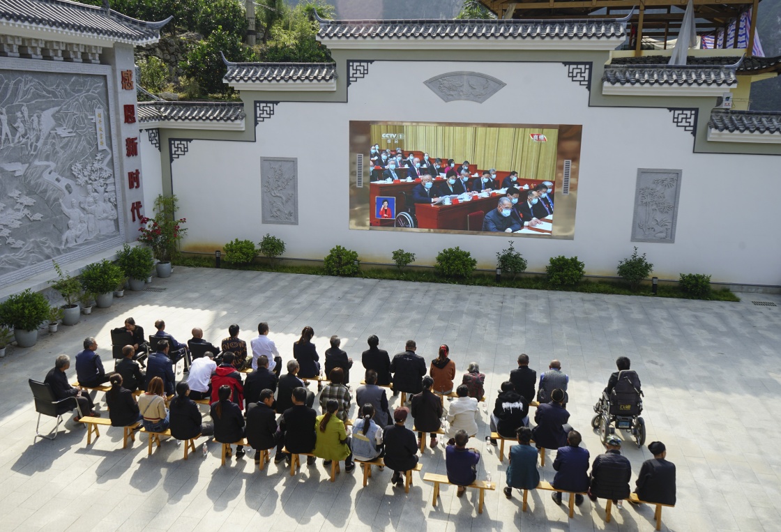 10月16日,在四川省阿坝州汶川县映秀镇渔子溪村,村民在收看中国共产党第二十次全国代表大会开幕会。
