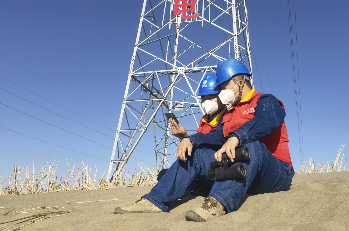 10月16日,在塔克拉玛干沙漠中,新疆和田供电公司保电人员在巡视110千伏输电线路途中,通过手机收看中国共产党第二十次全国代表大会开幕会。