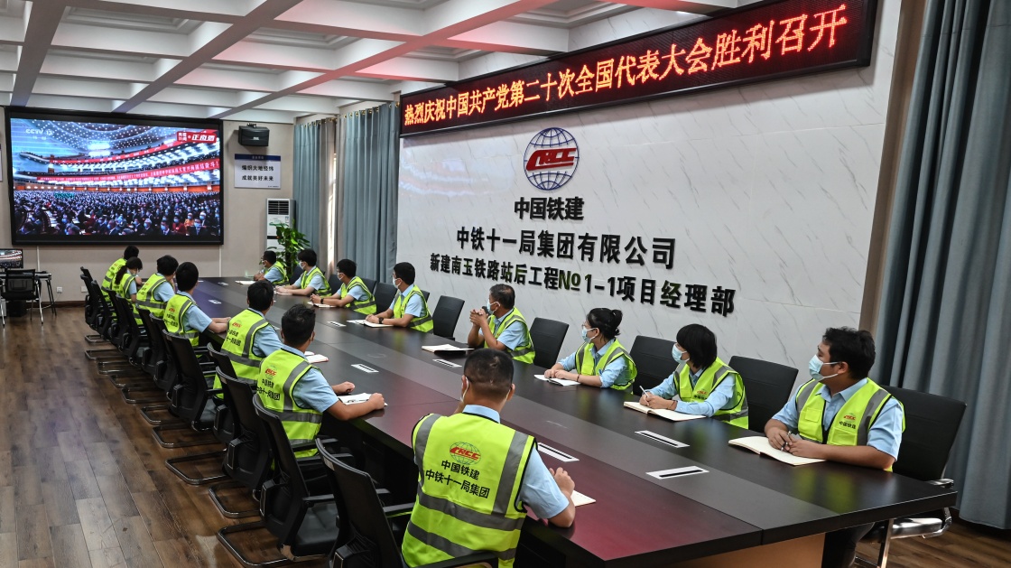 10月16日,广西南玉铁路玉林北站项目建设者在收看中国共产党第二十次全国代表大会开幕会。
