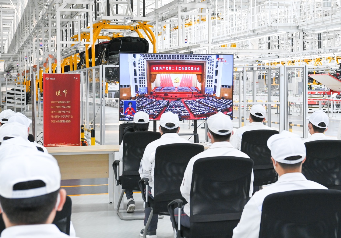 10月16日,在吉林省长春市中国第一汽车集团有限公司红旗繁荣工厂,职工在收看中国共产党第二十次全国代表大会开幕会。