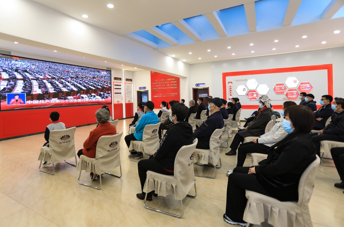 10月16日,在辽宁省沈阳市皇姑区三台子街道牡丹社区党群服务中心,居民和沈阳市皇姑区航空实验小学的少先队员收看中国共产党第二十次全国代表大会开幕会。
