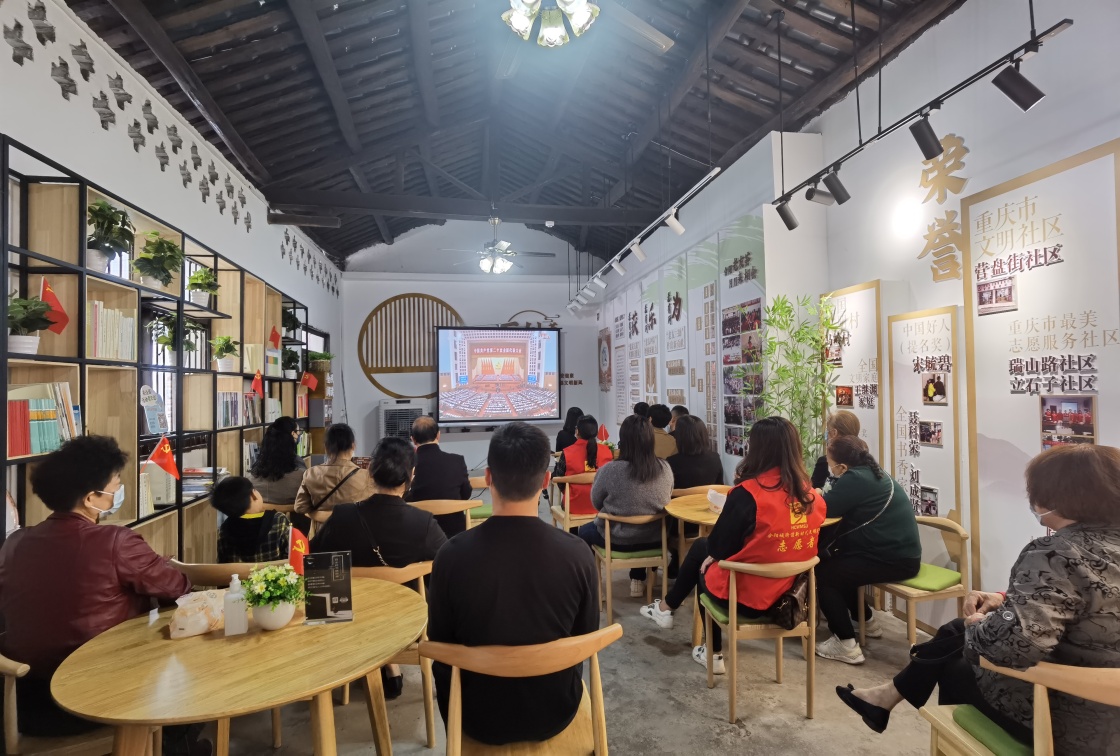 10月16日,在重庆市合川区合阳城街道新时代文明实践点,居民收看中国共产党第二十次全国代表大会开幕会。