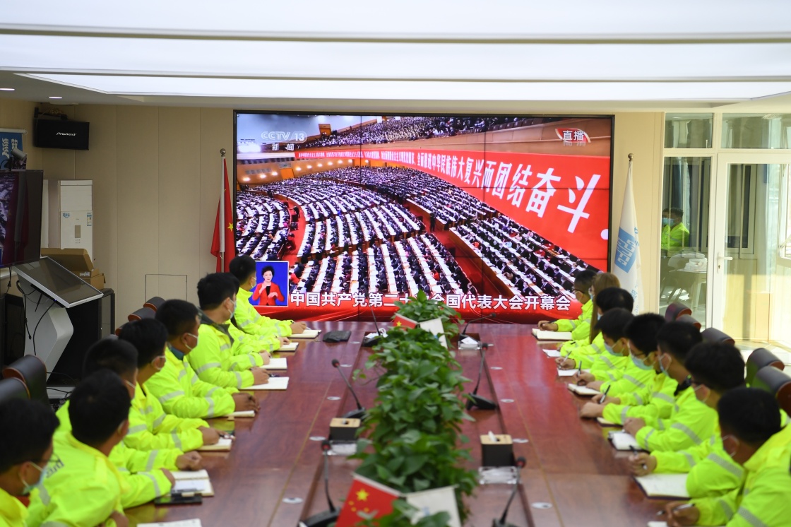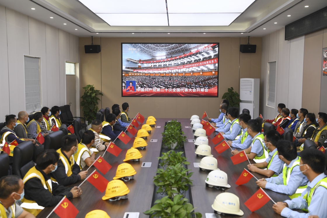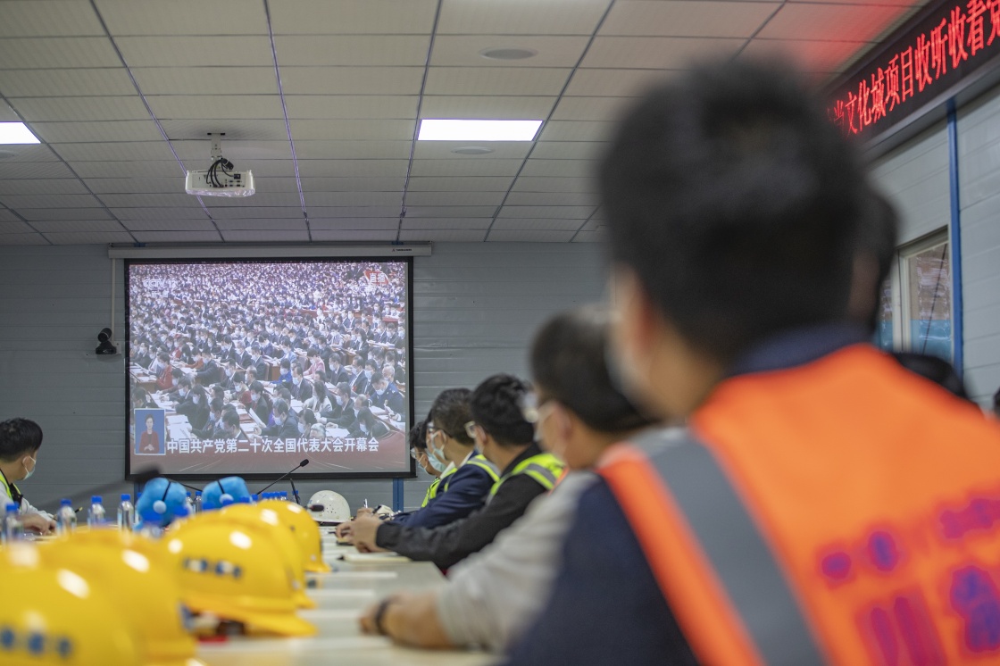 10月16日,在重庆时尚文化城项目,中建八局西南公司一线职工收看中国共产党第二十次全国代表大会开幕会。