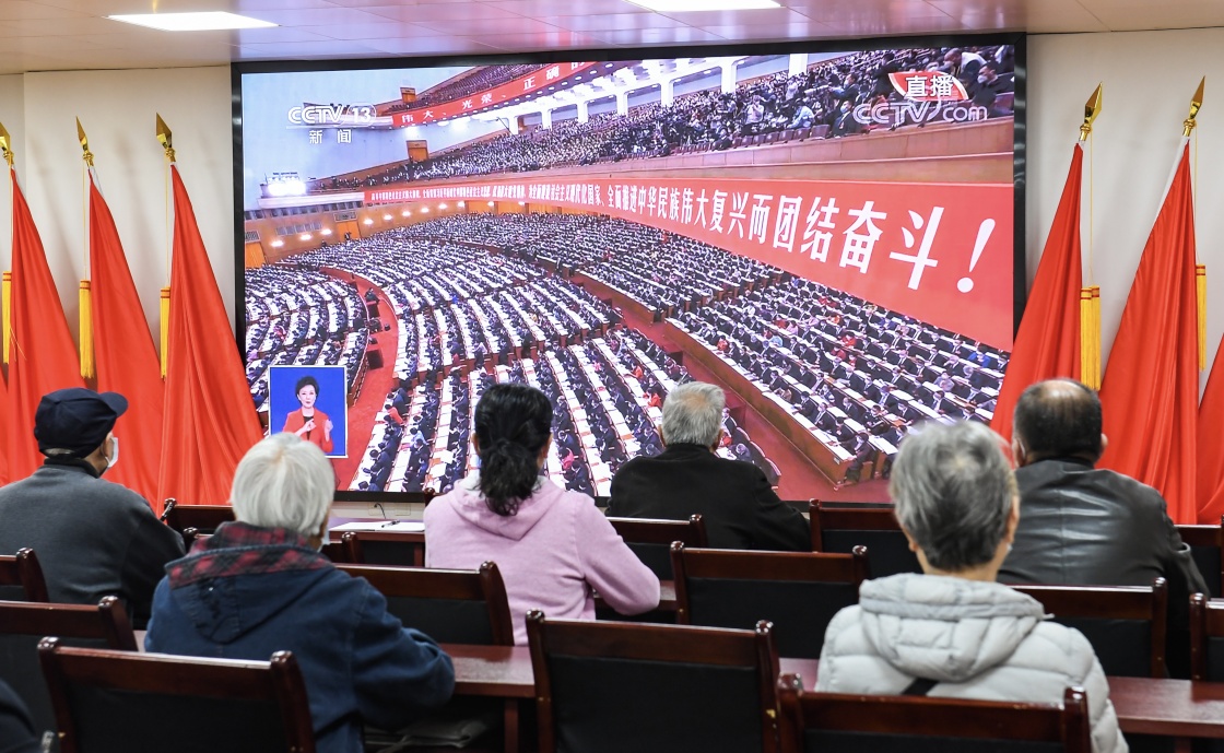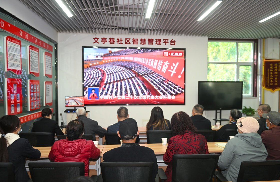 10月16日,在青海省西宁市城西区文亭巷社区党群服务中心,居民在收看中国共产党第二十次全国代表大会开幕会。