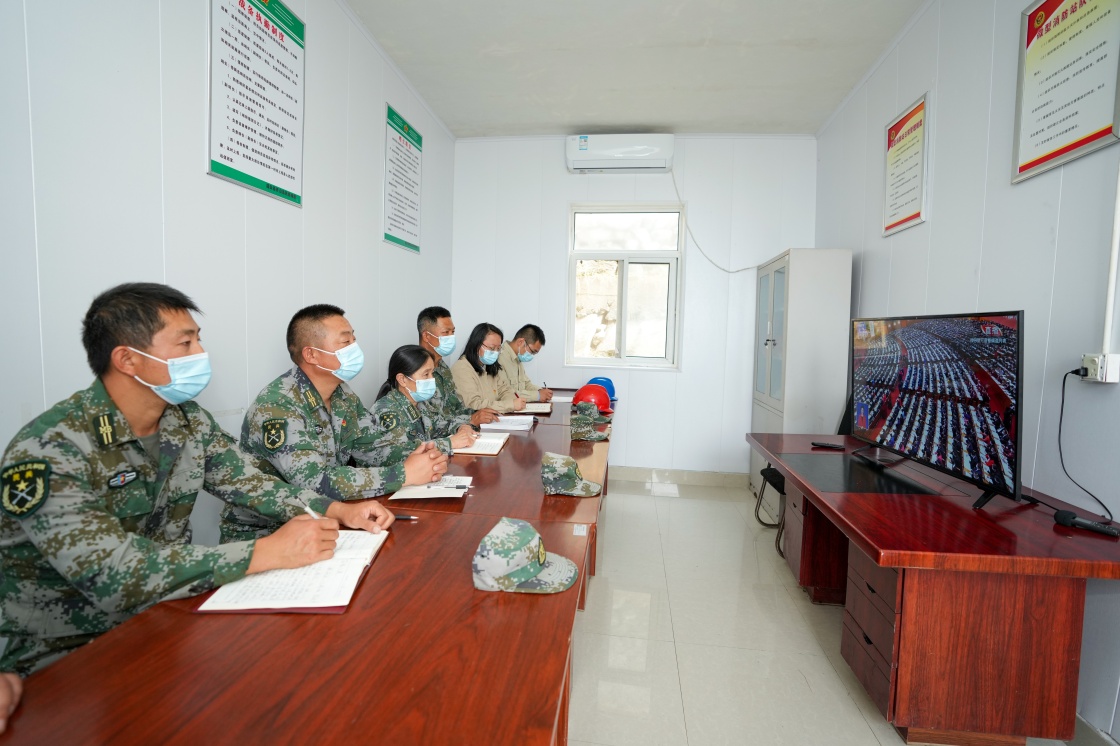 10月16日,在河北雄安新区中建二局容东项目部,工作人员在收看中国共产党第二十次全国代表大会开幕会。