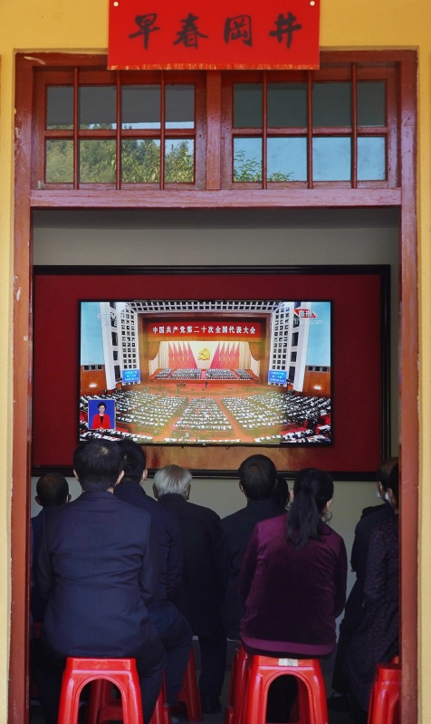 10月16日,江西省井冈山市茅坪镇神山村村民在村委会收看中国共产党第二十次全国代表大会开幕会。