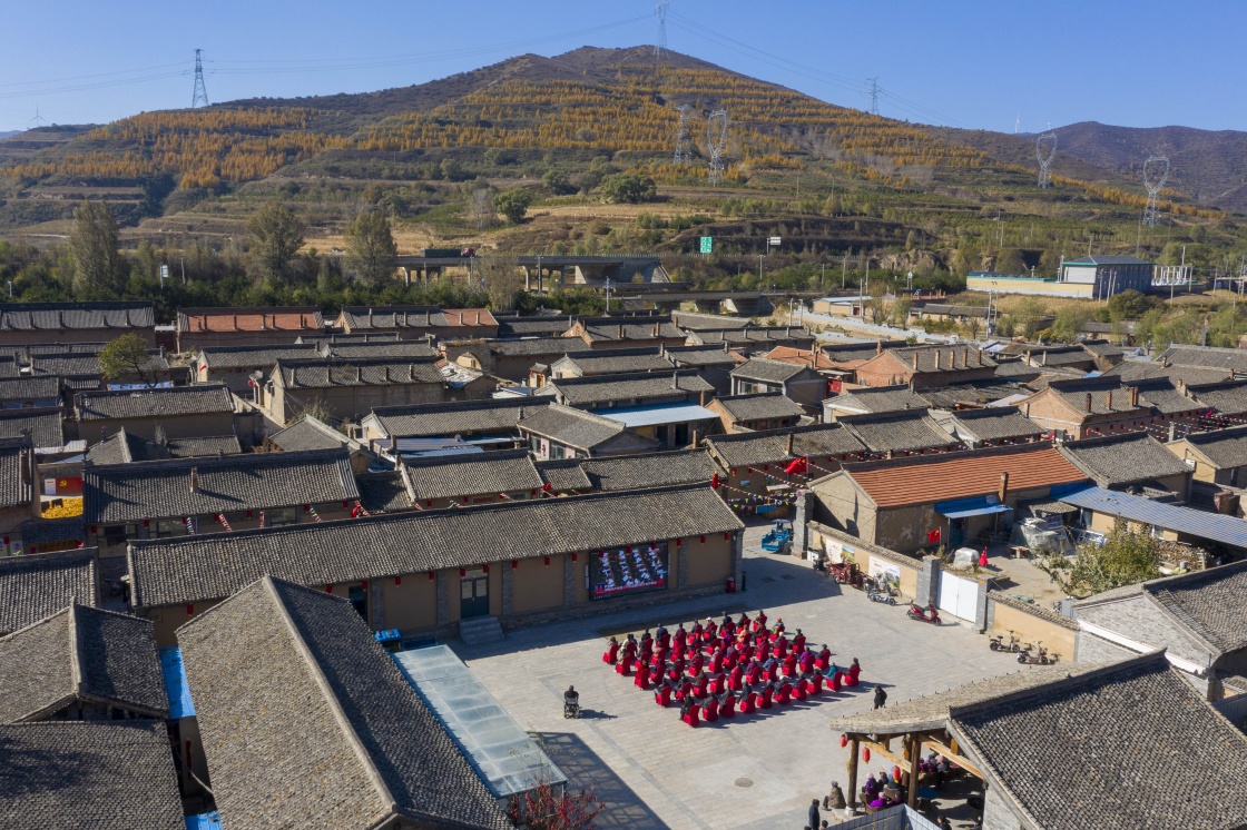 10月16日,山西省忻州市岢岚县宋家沟村村民在观看中国共产党第二十次全国代表大会开幕会(无人机照片)。