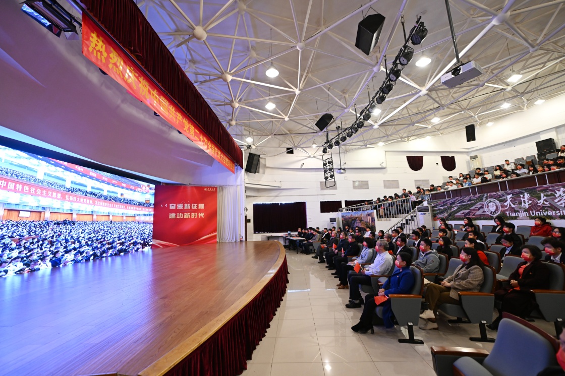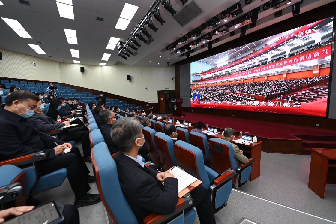 10月16日,天津大学部分师生代表在报告厅收看中国共产党第二十次全国代表大会开幕会。
