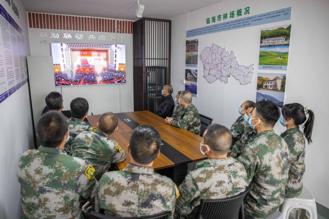 10月16日,浙江省台州临海市林场职工在位于括苍山的林场内收看中国共产党第二十次全国代表大会开幕会。