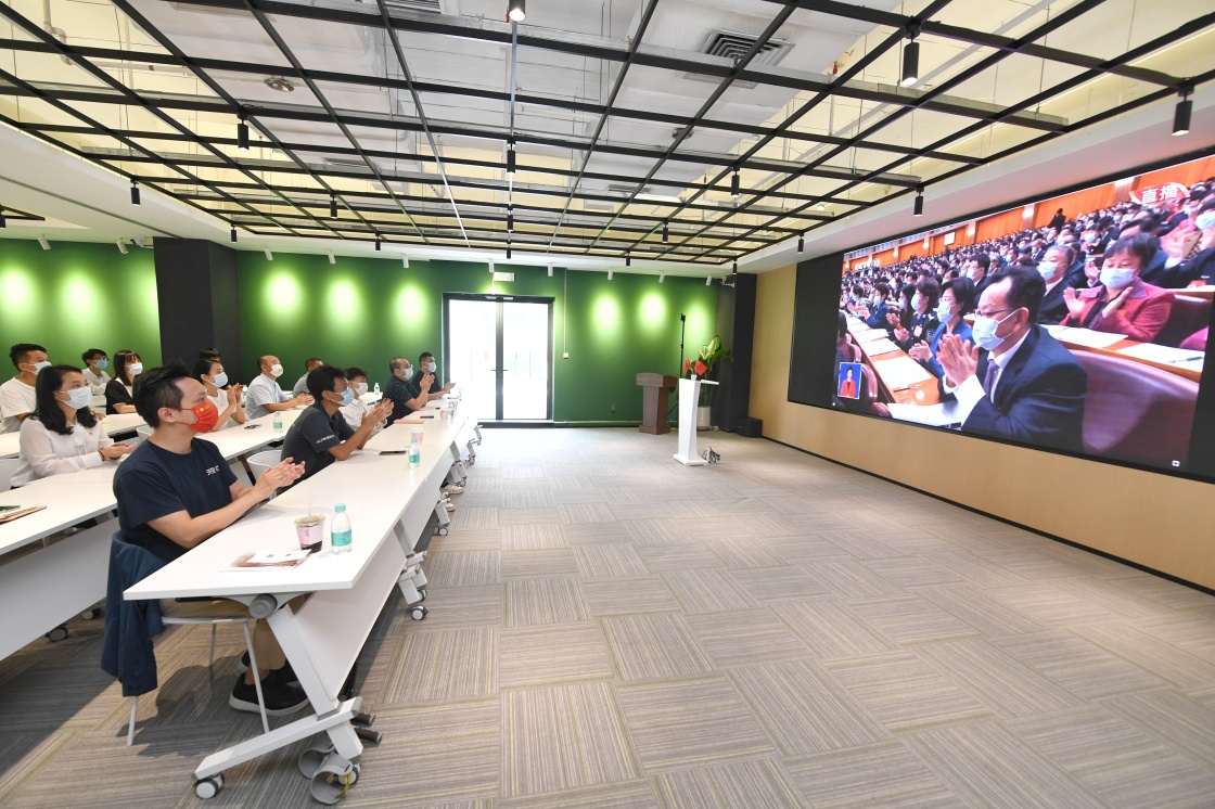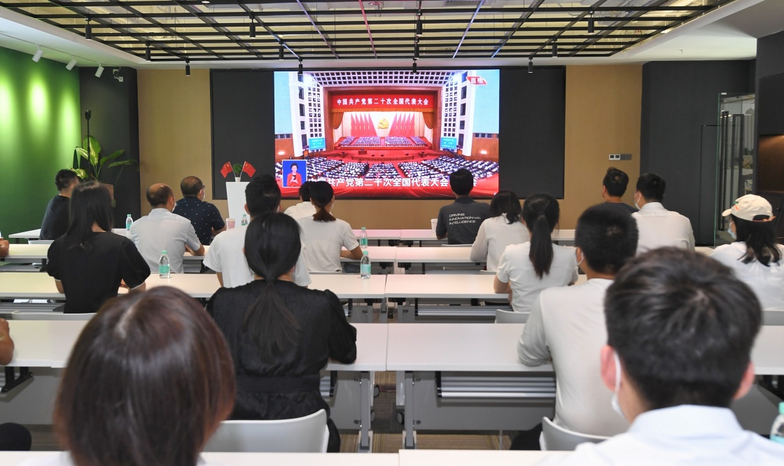 10月16日,在广东省深圳市前海深港青年梦工场北区,在前海工作的青年收看中国共产党第二十次全国代表大会开幕会。