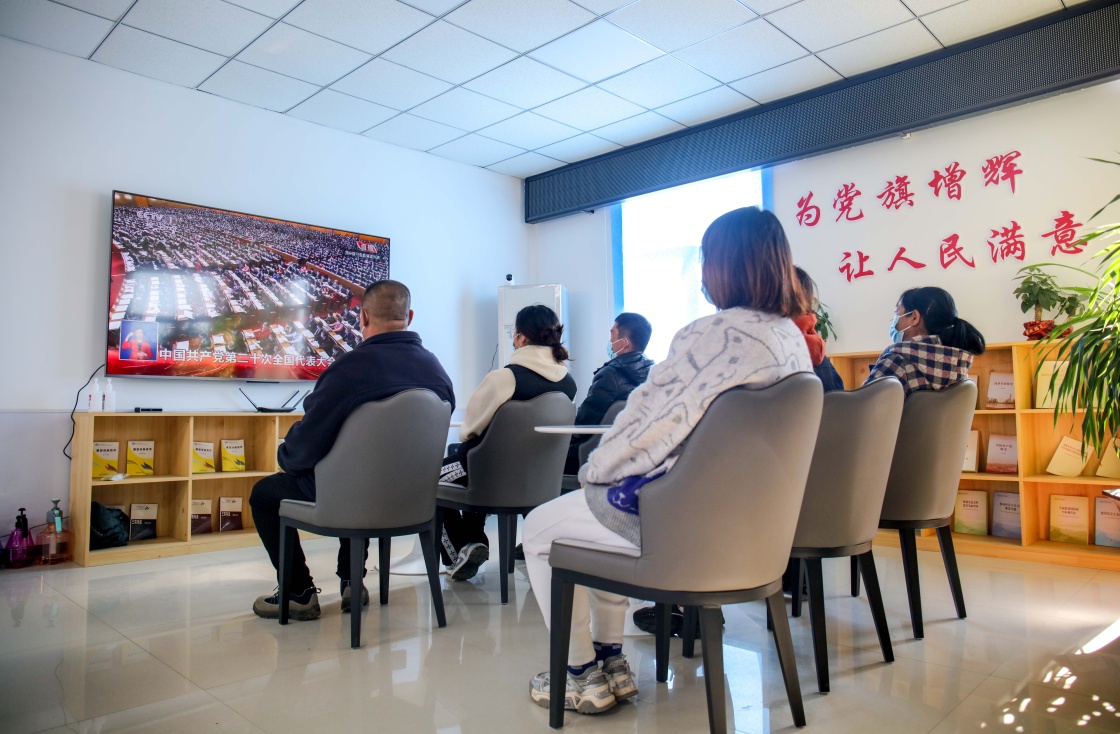 10月16日,在天津市滨海新区滨海-中关村科技园,企业员工在收看中国共产党第二十次全国代表大会开幕会。