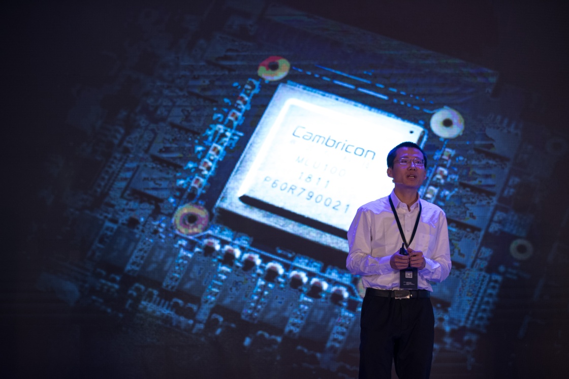 在上海国际会议中心举行的发布会上,寒武纪科技公司首席执行官陈天石介绍国内首款云端人工智能芯片(2018年5月3日摄)。新华社记者 金立旺 摄