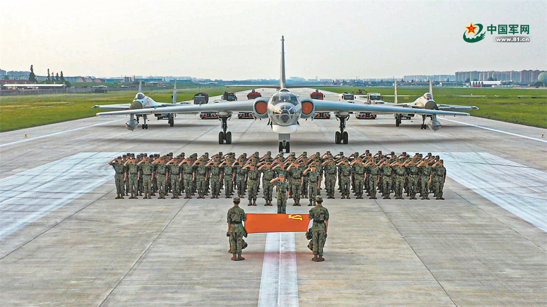 海军航空兵某场站组织向党旗宣誓活动,激励官兵忠诚维护核心、矢志奋斗强军,以优异训练成绩迎接党的二十大胜利召开。王硕鑫宇摄