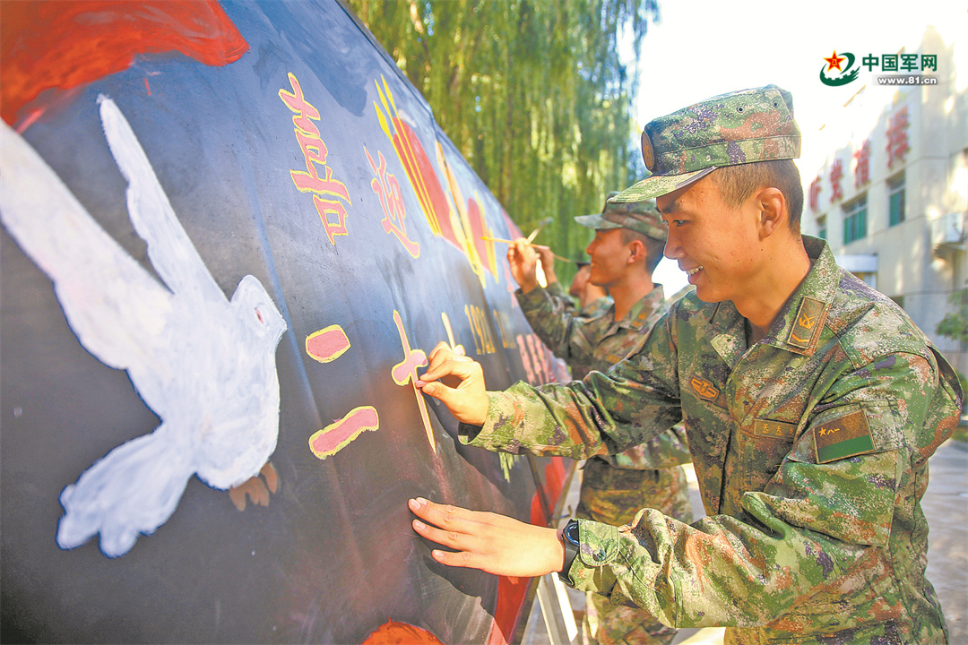 战略支援部队某大队开展“喜迎二十大、奋进新时代”主题板报评比活动。图为官兵正在设计制作板报。王克斌摄