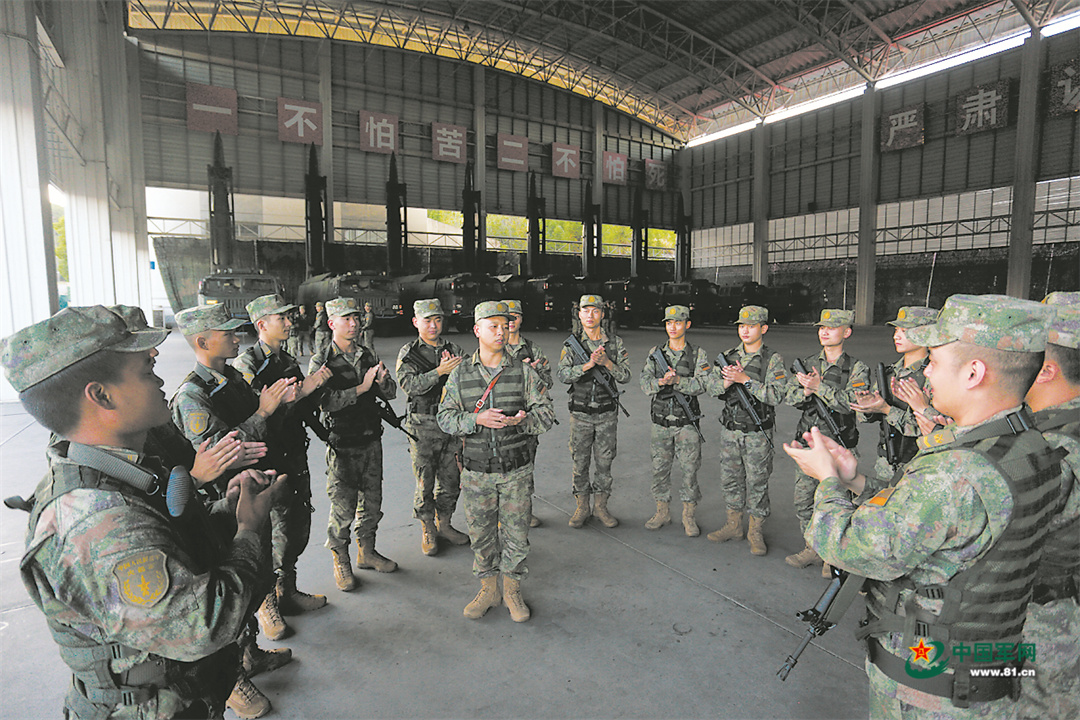 10月19日,火箭军某旅“导弹发射先锋连”训练间隙,连队干部宣讲党的二十大报告有关国防和军队建设的内容,引导官兵矢志奋斗强军。胡 耀摄