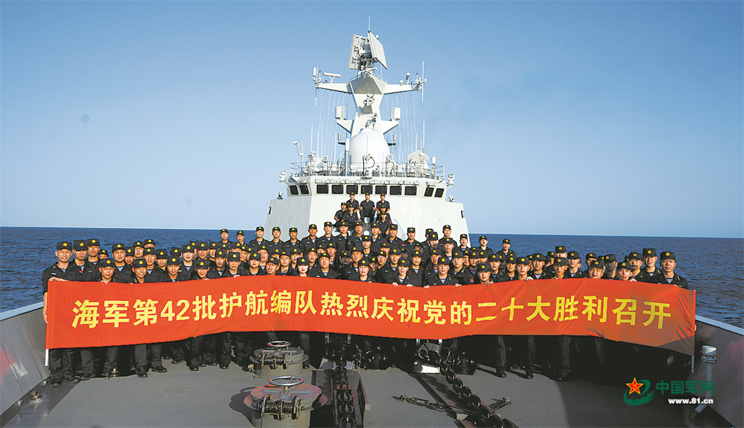 正在亚丁湾、索马里海域执行护航任务的海军第42批护航编队官兵,以昂扬士气履职尽责,庆祝党的二十大胜利召开。解放军报特约通讯员 马玉彬摄