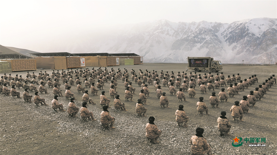 10月16日,新疆军区某合成团组织官兵在驻训场收看党的二十大开幕会直播。郝 宣摄