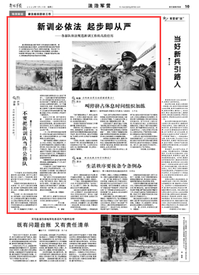 新训阶段是新兵提升素质、打牢基础的关键时期。部队各级在组织新兵训练时,必须按照军事训练法规严格展开,坚持依法治训从严治训,确保训练质量。带兵骨干作为新兵的引路人,要严格落实各项法规制度,坚决摒弃一味依靠习惯经验开展工作的做法,不断提升依法带兵能力,营造尊法学法守法用法的良好氛围。