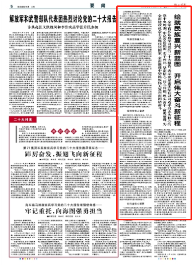 雪域高原,正在驻训的新疆军区某红军师官兵,通过广播、卫星电视同步收听收看盛会直播;南海之滨,陆军某旅“海防模范连”官兵利用巡逻间隙,手持移动终端跟进了解盛会动态;大山腹地,执行任务的中部战区空军某旅通过卫星电视、移动终端等设备,组织官兵收听收看盛会实况……二十大开幕盛况第一时间传遍神州大地的座座军营,全军官兵无不欢欣鼓舞、倍感振奋。