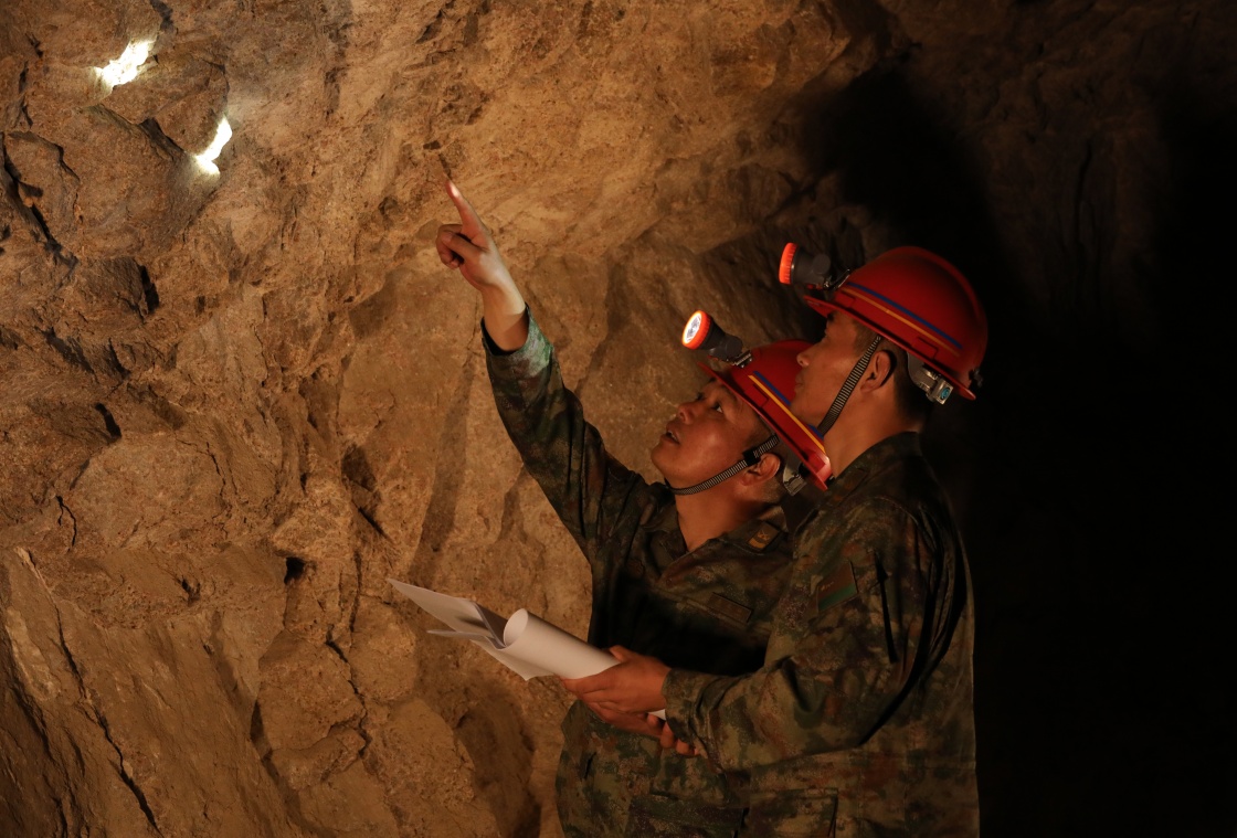 战略支援部队某旅技师唐武祥(左)检查作业面爆破情况(2022年7月23日摄)。新华社发(刘国辉 摄)