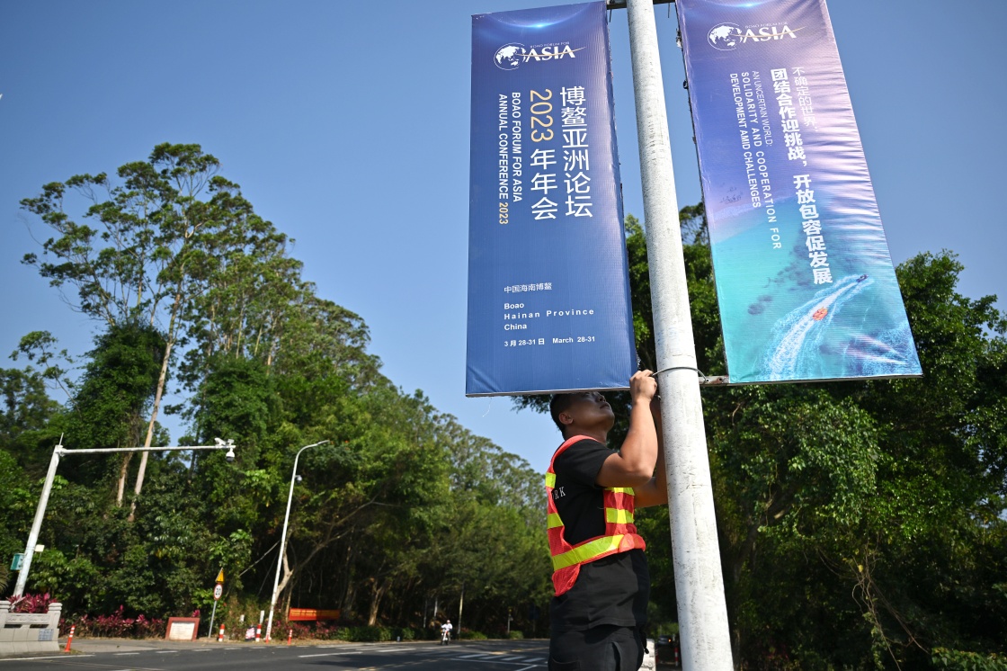 3月23日,工作人员在博鳌镇悬挂博鳌亚洲论坛2023年年会主题宣传牌。